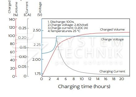 - Номинальное напряжение: 2В. Максимально допустимый ток заряда: 0,2C;